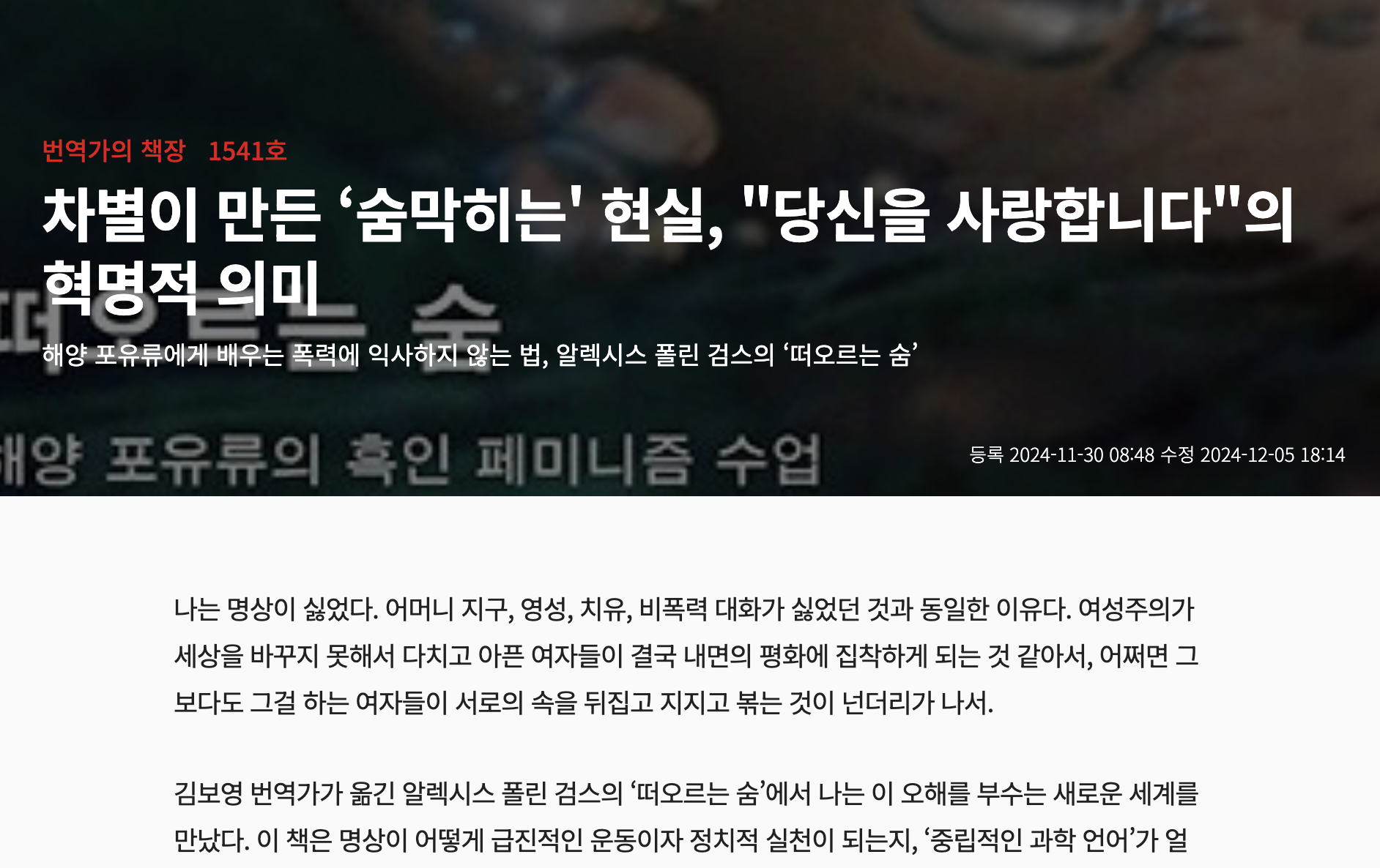 한겨레21 ’번역가의 책장‘에 <떠오르는 숨>이 소개되었습니다. 번역가 최이슬기 님이 <떠오르는 숨>을 읽고 써주셨어요. ”나는 명상이 싫었다. 어머니 지구, 영성, 치유, 비폭력 대화가 싫었던 것과 동일한 이유다“라는 첫 문장부터 즐거웠습니다. 페미니스트 혹은 사회의 구조적 문제를 적극적으로 의식하며 살아가는 사람들에게 ’명상‘이나 작가가 반복해서 말하는 ’사랑합니다‘ 같은 문장은 회피나 무딘 도구처럼 느껴질 수 있습니다. 이 책이 명상에 관한 이해의 폭을 넓혀준다면 그것은 저자가 명상이라고 말하는 문장들이 세계에 대한 정밀한 이해, 흑인 페미니스트 선조들과 연결되기 위해 치러야 할 투쟁 위에서 출발하기 때문일 것입니다. 이 부분을 세심하게 살펴주셔서 좋았습니다. 아래는 서평의 일부입니다. 전문을 읽어보시길 추천합니다.
